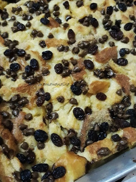 3. Tuangkan bancuhan tadi ke atas roti. Tekan2 roti supaya menyerap keseluruhan cecair yang dituang. Biarkan 5 minit. Taburkan kismis & coklat chip di atas puding. Sementara tu, panaskan oven suhu 175C.
